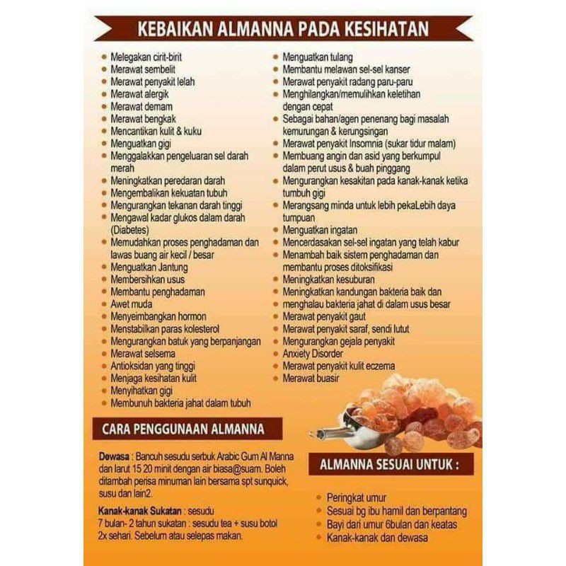 Gum Ara bic atau Al-Manna ini sangat baik dimakan oleh pesakit buah pinggang dan ia terbukti amat berkesan melalui kajian dan pengalaman pengamalnya ia juga dapat. 1 sudu teh 5gm.